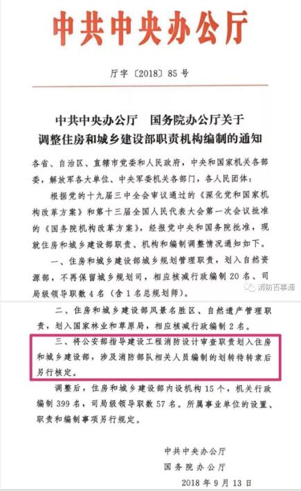 此前中央辦公廳曾正式發(fā)文,將公安部指導(dǎo)建設(shè)工程消防設(shè)計審查職責(zé)劃入住房和城鄉(xiāng)建設(shè)部,涉及消防部隊相關(guān)人員編制的劃轉(zhuǎn)待轉(zhuǎn)隸后另行核定。